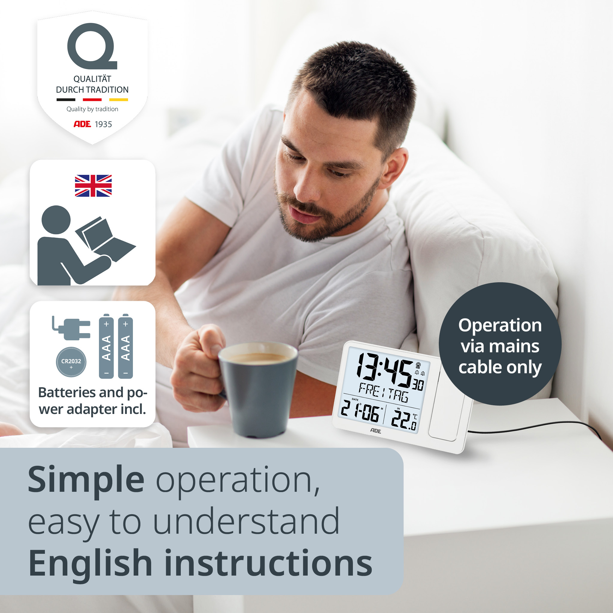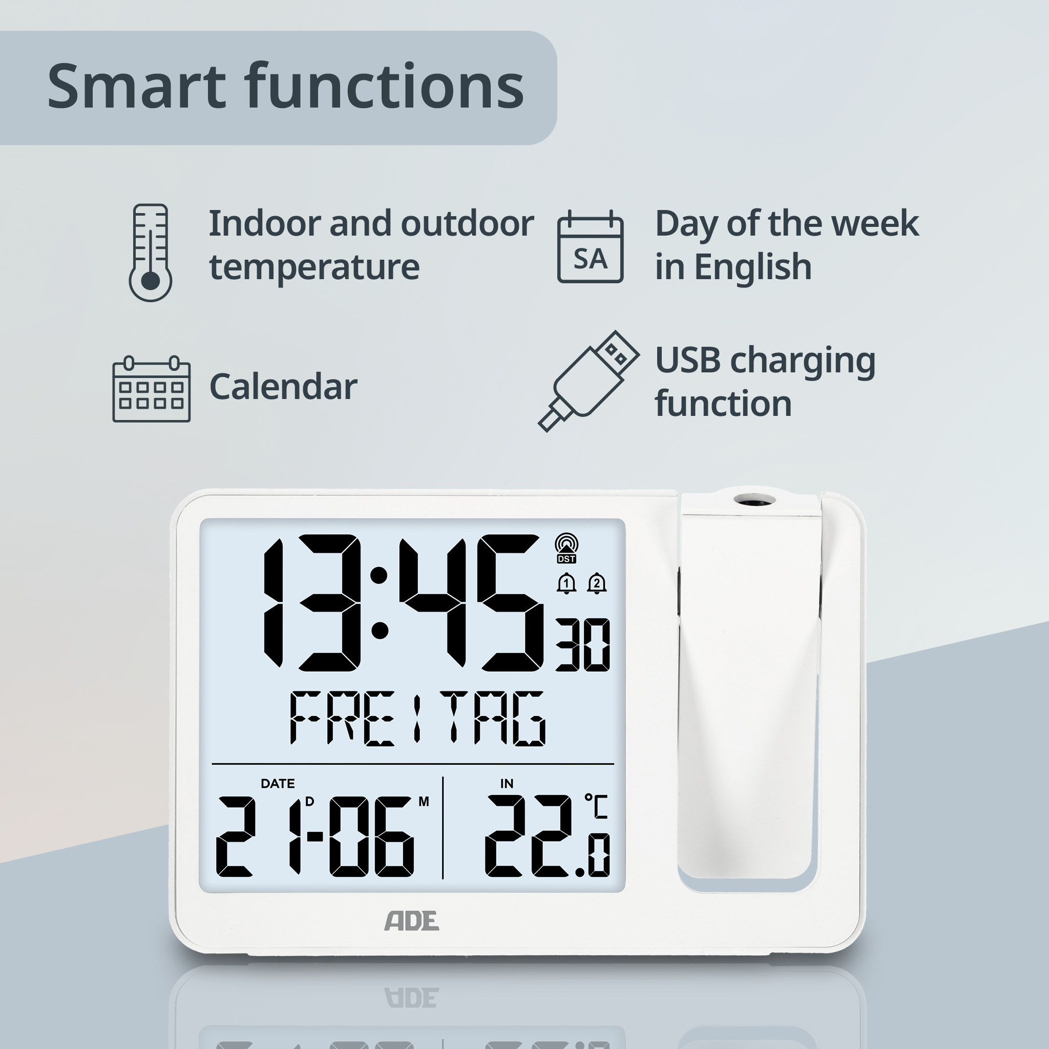 The ADE CK2406-2 radio clock features an extra-large, illuminated LCD display (94 × 82 mm) that clearly shows the time, date, day of the week (in seven languages) and indoor/outdoor temperature (°C or °F). It also has a projector that projects the time and temperature onto a wall or ceiling (180° rotatable) and a dual alarm with snooze function. Robustly built in an ABS housing and designed for modern rooms – ideal for bedrooms, studies or offices.