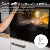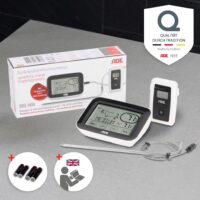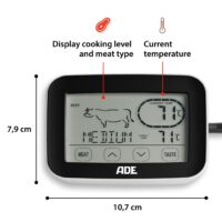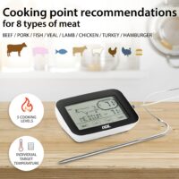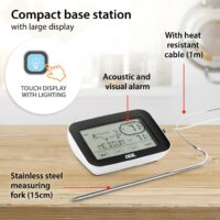 Relaxed cooking to the point – the mobile receiver (remote temperature monitoring) and the base station alert you by means of acoustic and visual alarms as soon as the cooking point has been reached. With the choice of seven different varieties of meat with up to five cooking levels and of individual temperature specification, every kind of meat can be cooked to perfection. The housing, made of high-quality ABS plastic, and the measuring fork made of stainless steel (16 cm insertion depth) are easy to clean.