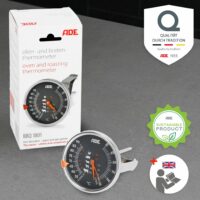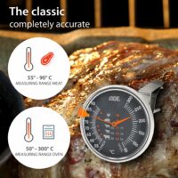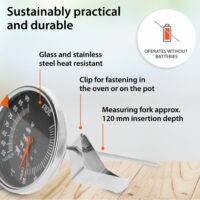 Good for household and barbecue, roasts and steaks: Because it is extremely heat-resistant, this roast thermometer can measure the core temperature of meat and the temperature in the oven at the same time. The housing and measuring fork are made of high quality stainless steel, the cover of the display is made of safety glass. The mechanical thermometer can withstand temperatures of up to 300 degrees Celsius. As a guide, recommendations for the core temperature are printed on the display.