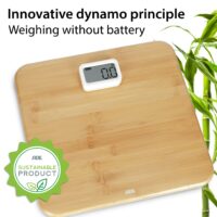The Kiana bathroom scales are packed with environmentally friendly details. We have dispensed with batteries altogether. And yet the scale works digitally. Thanks to the power display with dynamo principle. Pressing the display three times activates the dynamo and the scale is ready for weighing. The body of the scale is made of the renewable raw material bamboo. The amount of plastic is reduced to a minimum – only the weighing cells and display are made of white, unpainted plastic. The 12 mm thick footprint measures a comfortable 310 x 300, the LCD display 59 x 32 millimetres.