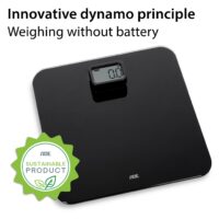 • Battery-free weighing thanks to dynamo principle – 3 x pressing the display charges the scale for one weighing operation