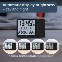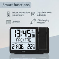 - Projection alarm clock with outdoor sensor: Clear projection of the time and temperature (indoor or outdoor) onto the ceiling or wall. The projection arm can be swivelled and the projection rotated through 180°. Includes outdoor sensor