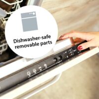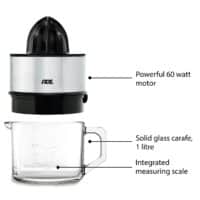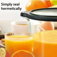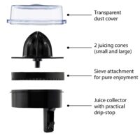 Fresh fruit juice in no time. Thanks to the automatic right-left run and an automatic start-stop function, the fruit is effectively squeezed – everything is possible, from the small lime to the large orange. Thanks to the practical drip stop, annoying after-running of juice residues after removing the press is prevented. The beautiful glass carafe has a practical pouring opening and looks great on the breakfast table. All removable parts are dishwasher-safe – there is no need for time-consuming manual cleaning.