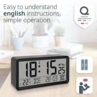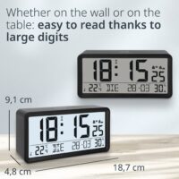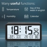 The digital desk clock with XXL digits is particularly suitable for individuals with visual impairments, seniors, and glasses wearers. The digital radio-controlled alarm clock offers 2 alarm times (e.g., Mon-Fri, Sat-Sun) including a snooze function with adjustable snooze time extension. To ensure perfect readability in the darkness, the display can be illuminated for approximately 10 seconds at the touch of a button. Additionally, the digital clock displays the temperature, humidity, as well as the date and day of the week (available in 7 languages).