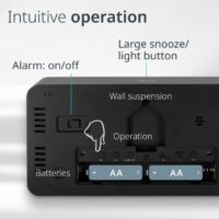 Thanks to the precise radio reception, the desk clock automatically sets the exact time and switches between daylight saving time and standard time. The wide base ensures a secure stand on the table, while a hanging loop on the back allows for wall mounting.