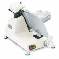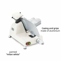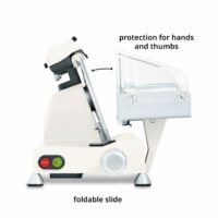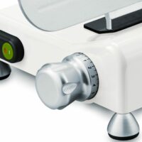 For over 80 years, ADE has been a manufacturer of professional scales and machines for the gastronomy industry. Drawing from this experience, we bring the quality and user-friendliness of our electric food slicer KA 1806 to the private kitchen. At first glance, the food slicer is a delight. The sturdy aluminum housing impresses with its Italian design, painted in elegant “Milano White.” The handle, adjustment knob, and blade are made of high-quality aluminum, including the smooth sliding carriage with a large cutting board, which can be easily folded to the side for effortless cleaning with just one hand. For safety during slicing, the fixed knife guard and the integrated hand and thumb guard made of transparent plastic ensure secure operation.