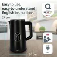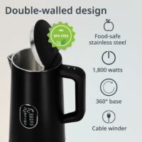 The kettle can hold up to 1.5 liters of water with its high-quality equipment. The double-walled housing is made of stainless steel inside (18/8 SS 304). On the outside, high-quality ABS plastic in an attractive gray color adds an elegant touch and protects the hands. Safety is ensured by the concealed heating element in the kettle, the Strix controller (automatic shut-off when lifted from the base), as well as overheating and dry boil protection.