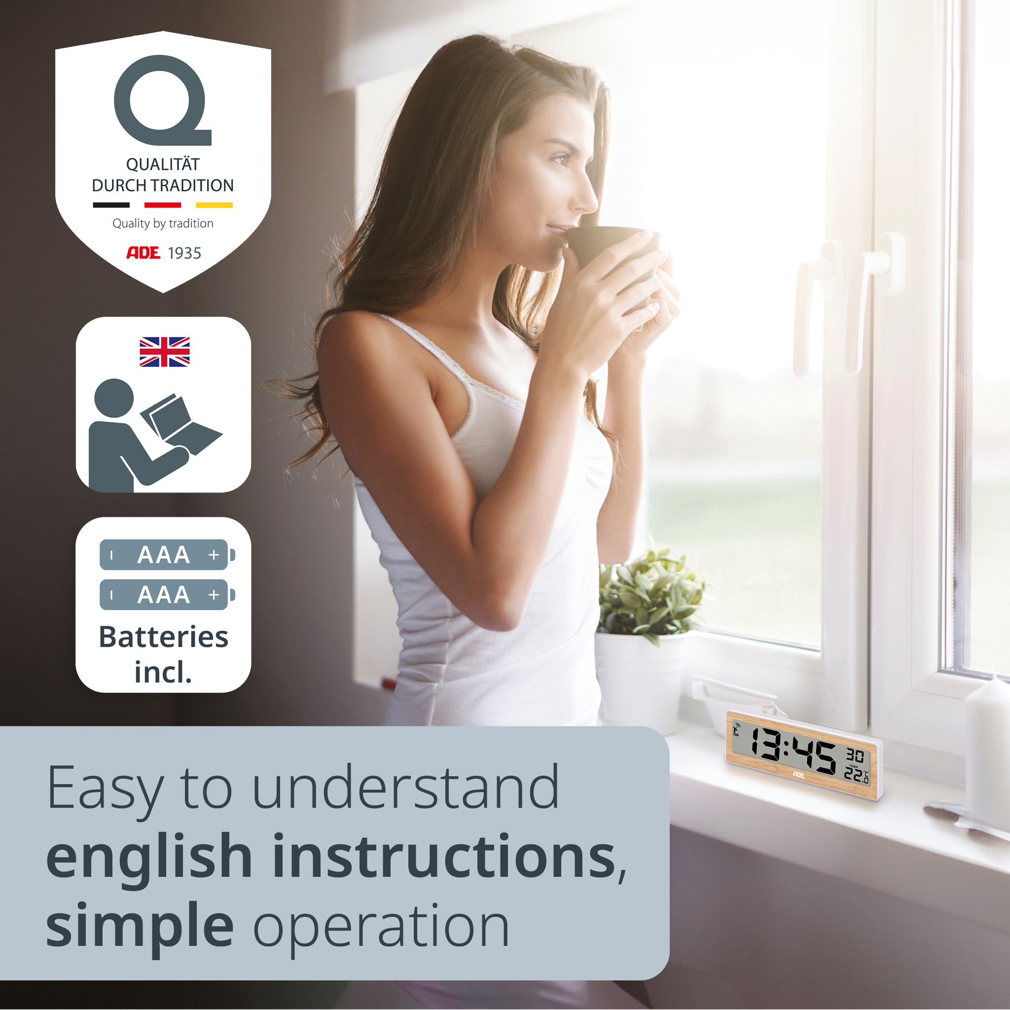 - Minimalist design: The ADE radio clock convinces with its slim design with real bamboo frame and a clear, generous display that is reduced to the essentials – perfect for any modern home.