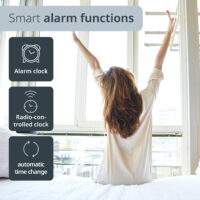 - Radio-controlled clock (DCF radio signal), automatic and manual time setting
