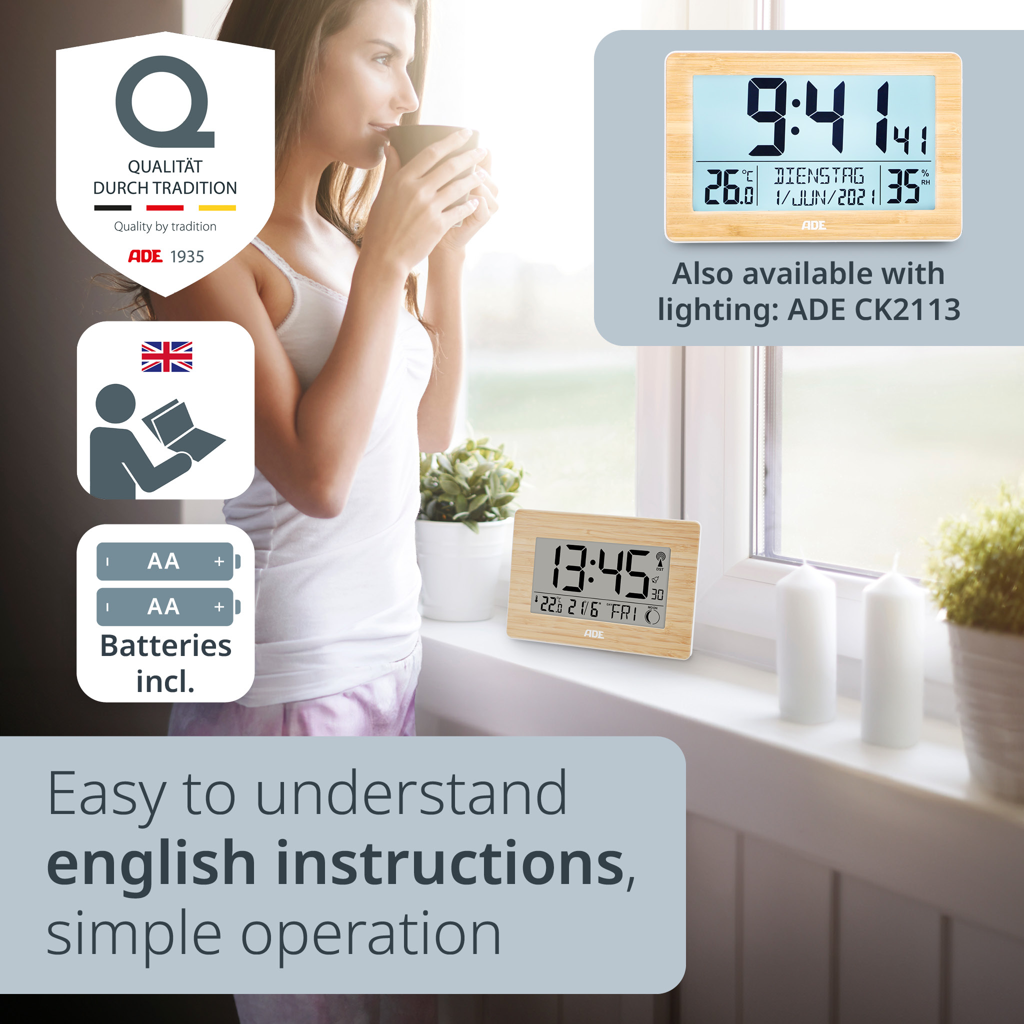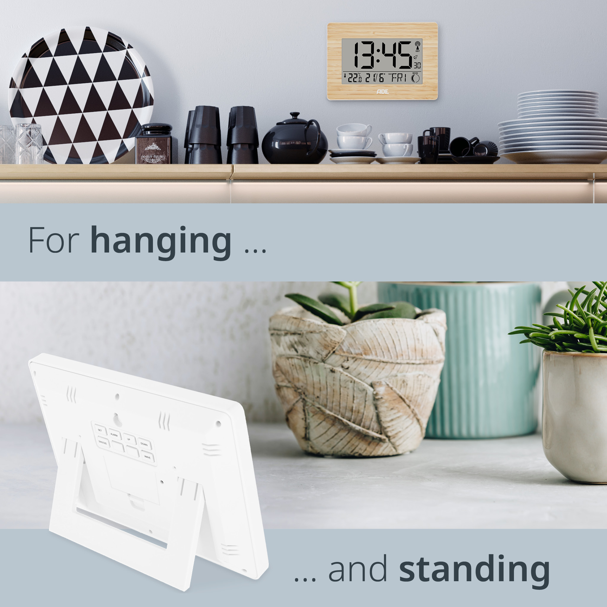 - Radio-controlled clock (DCF radio signal), automatic and manual time setting