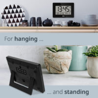 This radio-controlled clock focuses not only on the time with digits in XXL format, but also on the temperature display. The large, clear LCD display also shows the current date with day display in seven languages and the moon phase. In addition, the clock includes an alarm clock with snooze function. The DCF time signal automatically switches between summer and winter time. The digital radio clock, which is suitable for hanging and standing, is packed in a high-quality ABS plastic frame with a front made of real bamboo wood.