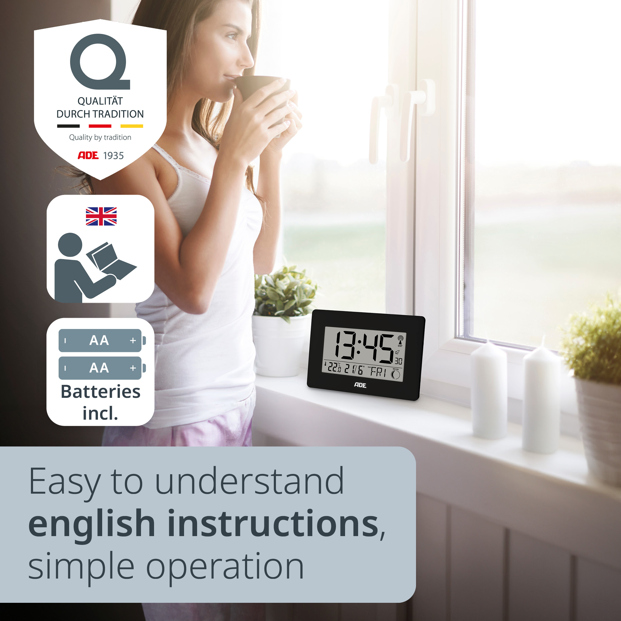 This radio-controlled clock focuses not only on the time with digits in XXL format, but also on the temperature display. The large, clear LCD display also shows the current date with day display in seven languages and the moon phase. In addition, the clock includes an alarm clock with snooze function. The DCF time signal automatically switches between summer and winter time. The digital radio clock, which is suitable for hanging and standing, is packed in a high-quality ABS plastic frame with a front made of real bamboo wood.