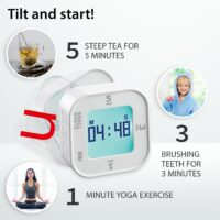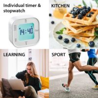 Tilting or tapping. It’s time for the digital kitchen timer with tilt start from ADE, which also displays the current time and serves well outside the kitchen too! It has three pre-set countdowns: 1, 3 and 5 minutes. They can be activated very easily by tilting the handy timer to the respective side. Also individual times can be set on the LCD display by just pressing a button. When the time is up, the display signals: Done! But an acoustic alarm can also be set in addition. Carrying your timer around with you? Then the vibration alarm makes sense, which is also available for selection.