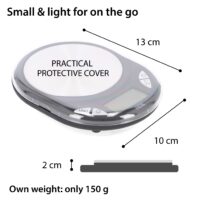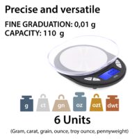 The high-precision pocket scale weighs fine ingredients from up to 110 grams to a hundredth of a gram. The scale provides the right basis for investigations into gold purchases and for operators of goldsmiths and gemstone shops. The multitude of units makes it possible: grams, carats, grains, ounces, troy ounces and penny weights. The scale has a protective cover made of ABS plastics. This is ideal as a weighing pan and can be easily balanced thanks to the weighing function (tare). The weighing surface is made of brushed stainless steel.