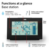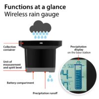Smart garden friend – rain measurement for optimal watering. The smart garden helper consists of two parts. The rain sensor in the form of a funnel determines the current amount of precipitation via flow measurement. From this, the amount of rain for 1 hour, 24 hours, 7 days, 1 month and 1 year is calculated and finally displayed in millilitres or inches on the LCD display of the base station. The connection to the outdoor sensor is made by radio, via which the outdoor temperature is also transmitted. Further relevant data is provided by an indoor thermometer with temperature trends.