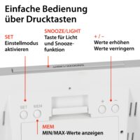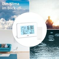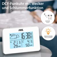 The ADE weather station looks into the future for up to eight hours. The weather forecast is shown in animated form on the white illuminated LED display of the base station. Whether the sun is shining, a mix of sun and clouds, clouds or rain is to be expected – clear symbols signal the current weather forecast. The temperature is measured from -20 to +60° Celsius and can optionally be changed to Fahrenheit. The humidity is measured in the range from 20 to 95 %. Both thermometer and hygrometer are equipped with a memory function for the highest and lowest measured value. Also included is a radio-controlled clock with DCF time signal including alarm clock and snooze function.