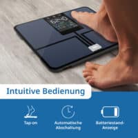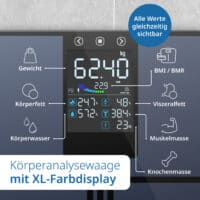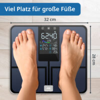 • Alle Körperwerte auf einen Blick sichtbar: Die Personenwaage zeigt Gewicht, Körperfett, Muskelmasse, Wasseranteil, Knochenmasse, BMI, BMR und biologisches Alter gleichzeitig im Display an