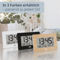 Bei dieser Funkuhr steht neben der Uhrzeit mit Ziffern im XXL-Format auch die Temperaturanzeige im Fokus. Auf dem großen, übersichtlichen LCD-Display wird außerdem das aktuelle Datum mit Tagesanzeige in sieben Sprachen und die Mondphase angezeigt. Zusätzlich beinhaltet die Uhr einen Wecker mit Schlummerfunktion. Durch das DCF-Zeitsignal erfolgt die Umstellung von Sommer- und Winterzeit automatisch. Verpackt ist die digitale Funkuhr, die zum Hängen und Stellen geeignet ist, in einen hochwertigen ABS-Kunststoffrahmen mit einer Front aus echtem Bambus-Holz.