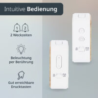• Funktionen: 2 Weckzeiten für entspanntes Ausschlafen am Wochenende (Weekendmode), lauter Wecker mit Licht auf Knopfdruck (8 Sek.) oder automatisch bei Dunkelheit mit Lichtsensor, Snoozefunktion (5 Min)