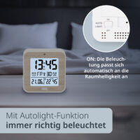 • Uhr mit Temperaturanzeige, Hygrometer, Datum: Die Funkuhr misst Temperatur (°C/°F) und Luftfeuchtigkeit für gutes Raumklima ohne Schimmelgefahr. Der digitale Wecker zeigt Datum/Wochentag (DE, EN, ES, IT, FR, NL, DK) an
