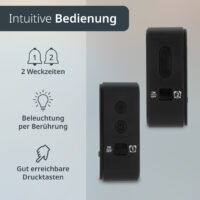 - Funktionen: 2 Weckzeiten, die unabhängig voneinander eingestellt und (de)aktiviert werden können (z.B. Wochentage/Wochenende), lauter Wecker mit Licht auf Knopfdruck (8 Sek.) oder automatisch bei Dunkelheit mit Lichtsensor, Snoozefunktion (5 Min)