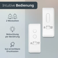 - Funktionen: 2 Weckzeiten, die unabhängig voneinander eingestellt und (de)aktiviert werden können (z.B. Wochentage/Wochenende), lauter Wecker mit Licht auf Knopfdruck (8 Sek.) oder automatisch bei Dunkelheit mit Lichtsensor, Snoozefunktion (5 Min)